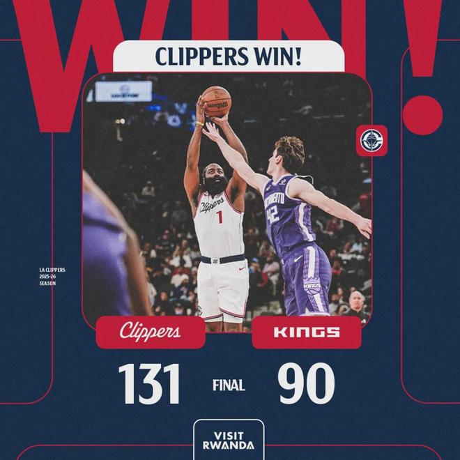 國王第三節31-27追回4分,但依然難阻敗局。為了保險起見,第四節泰倫盧又讓倫納德打了5分鐘,領先到39分才將其換下。全場結束,快船131-90狂勝國王,快船豪取5連勝,繼續北伐!倫納德19中11,砍下33分5板5助3斷1帽!