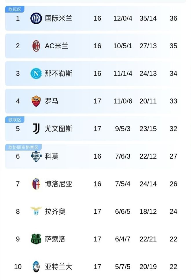 而衛冕冠軍那不勒斯34分屈居第3位,羅馬和尤文分別積33分和32分,排名第4和第5位,尤文則領先身后的第6名科莫隊多達5分。